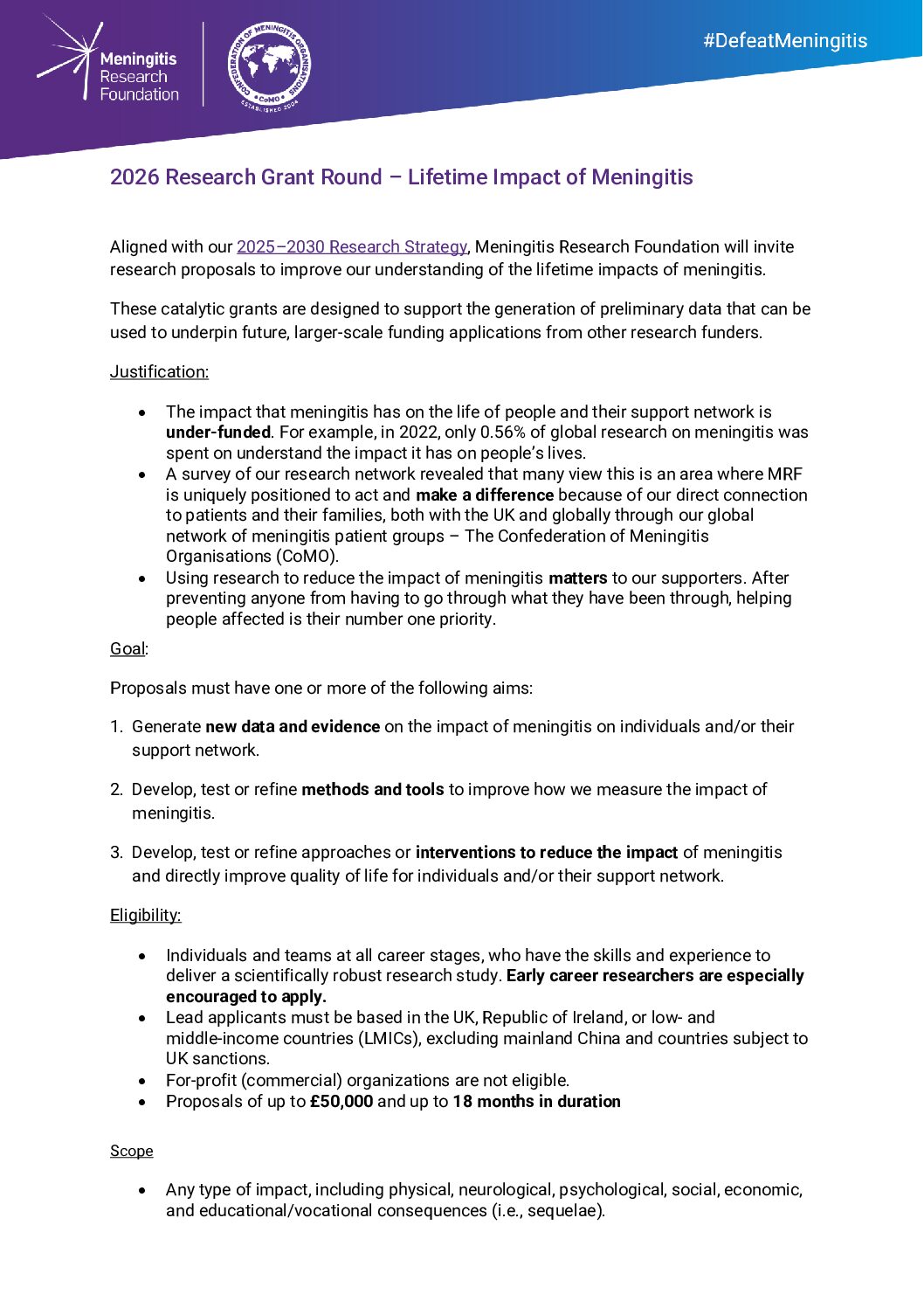Aligned with our 2025–2030 Research Strategy, Meningitis Research Foundation will invite research proposals to improve our understanding of the lifetime impacts of meningitis. These catalytic grants are designed to support the generation of preliminary data that can be used to underpin future, larger-scale funding applications from other research funders.