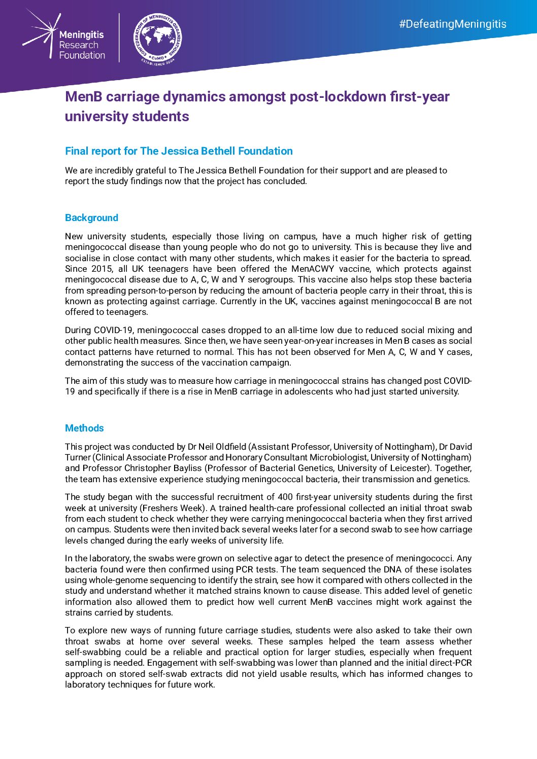 We are pleased to share the final report of a study tracking meningococcal carriage in first-year university students after COVID-19 lockdowns. The research shows how MenB and other meningococcal strains spread during early university life, providing important insights for vaccination strategies and future public health monitoring.